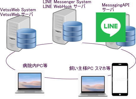 このサイトはLINEのマニュアルに基づき、LINE WebHookサイトとして構築されいて、VetssWeb(動物病院管理WEBシステム)上から各病院毎の公式アカウントを取得した上で、利用が可能になります。特に公式アカウントの利用において、LINE WebHook動作するサーバにより、独自のメッセージ処理が可能となります。